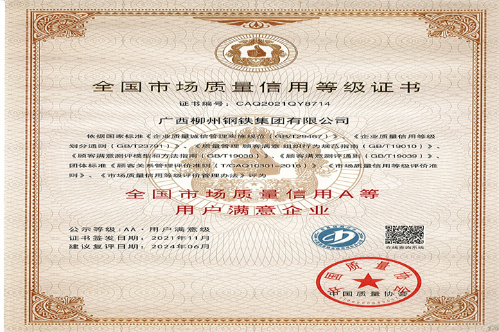 全國市場(chǎng)質(zhì)量信用AA級用戶(hù)滿(mǎn)意企業(yè)證書(shū)